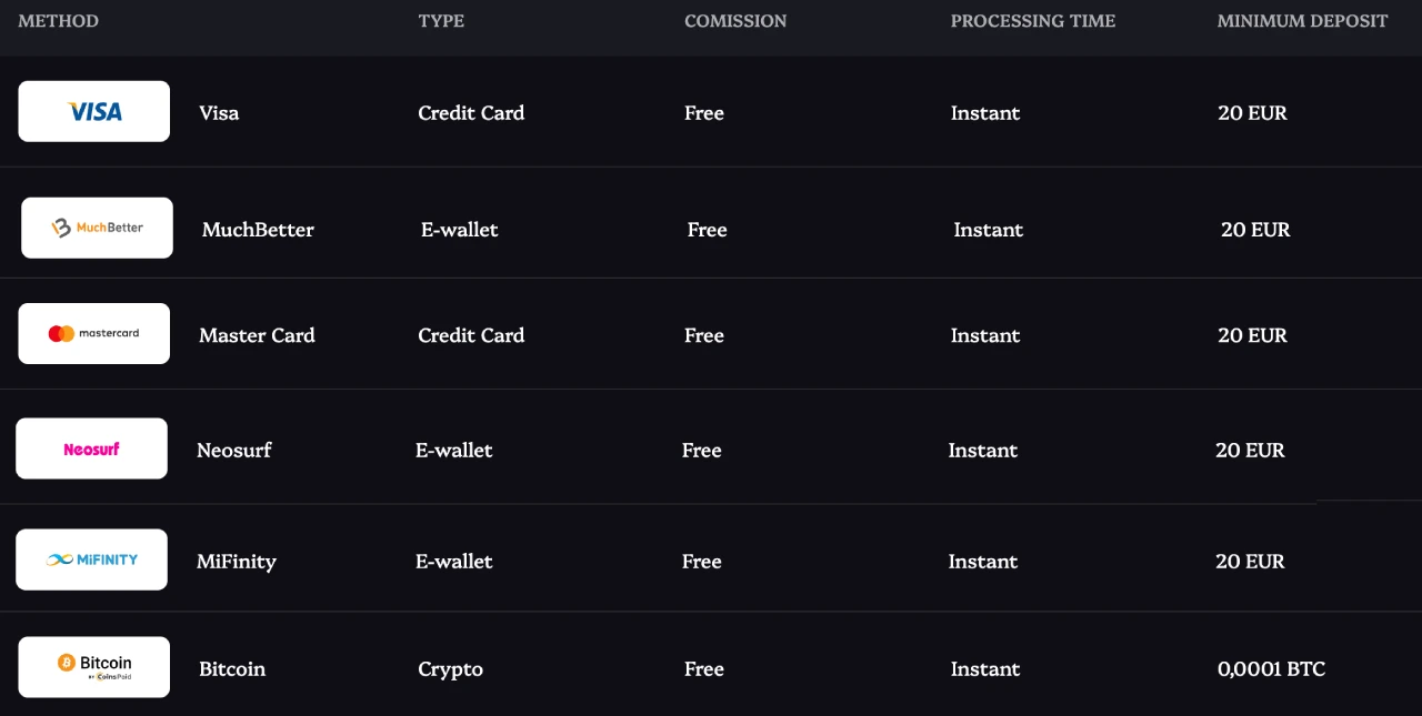 Innskudd- og uttaksmetoder: VISA, MasterCard, MiFinity, MuchBetter, Neosurf, Bitcoin, Litecoin, Ethereum, Dogecoin, Tether, Bitcoin Cash