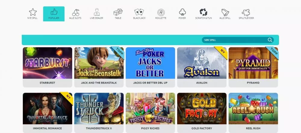 Spilleautomater, bordspill, videoautomater, live casino, video poker, skrapelodd og poker er bare noen av de spillkategoriene du kan hygge deg med, så her er det bare å sette i gang.